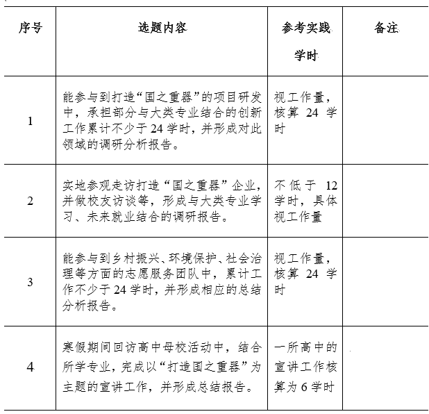 2.实践选题:鼓励在“打造国之重器”的主题下,开展“国之重器”企业调研走访、校友访谈等;结合大类专业开展创新创业实践;开展乡村振兴、环境保护、社会治理等方面的志愿服务和社会实践。在小班思政实践课指导教师的指导下,完成智慧树平台上发布的《思想政治理论实践课实践选题与计划表》(详见附件1)等作业环节。选题认定学时参考如下: